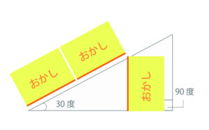 はり合わせているところから、箱の高さの2倍の距離に、箱の端を合わせて置くとだいたい30度になります。